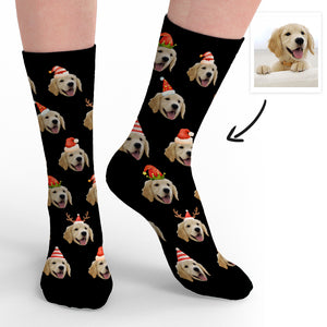 Custom pet face Christmas socks featuring personalized dog photo patterns for unique holiday gifting